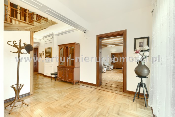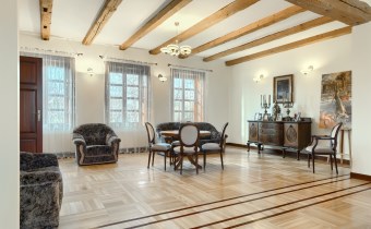 - Drewniane podłogi (parkiet), kuchnia i piwnica – płytki