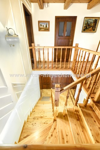 - Parapety, drzwi wewnętrzne i zewnętrzne – drewniane, robione na zamówienie
