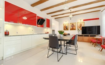 - Kuchnia w zabudowie (sprzęty AGD: płyta, piekarnik, lodówka, zmywarka)