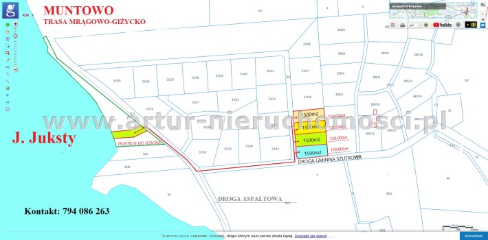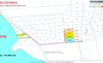 Na sprzedaż działka numer 33/54 o pow. 1505m2, w miejscowości Muntowo na trasie Mrągowo- Mikołajki z możliwością uzyskania WZ, oraz prawem dojścia do j.Juksty i korzystania z linii brzegowej (działka 356),. Dojazd do działki drogą gminną, przy której znajduję się wodociąg, sieć elektroenergetyczna w trakcie realizacji,