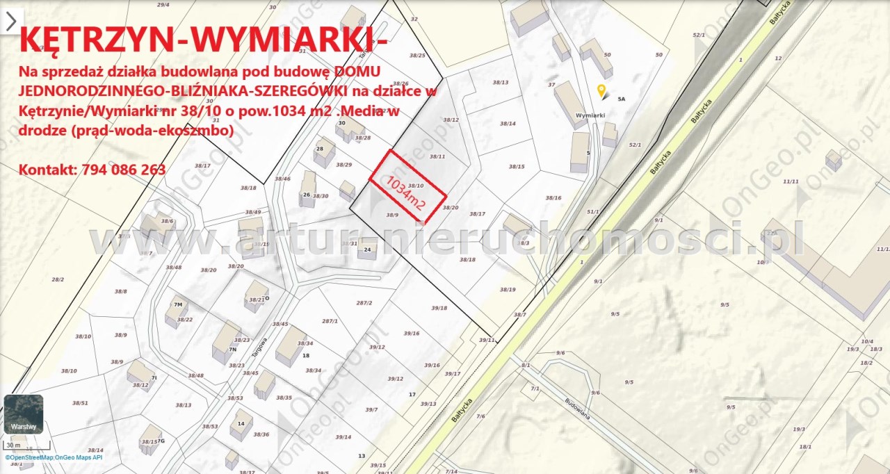 Na sprzedaż działka budowlana pod budowę DOMU JEDNORODZINNEGO-BLIŹNIAKA-SZEREGÓWKI na działce w Kętrzynie/Wymiarki nr 38/10 o pow.1034 m2 .Media w drodze (prąd-woda-ekoszmbo)
