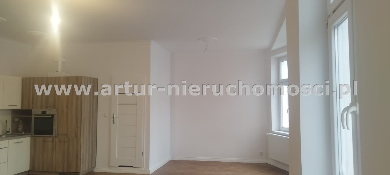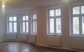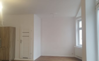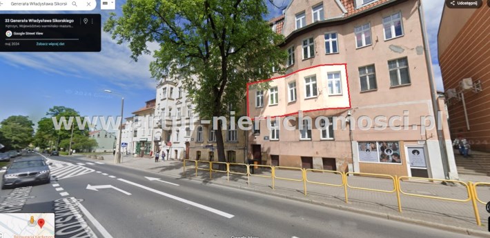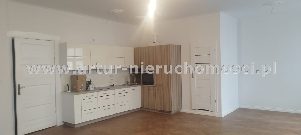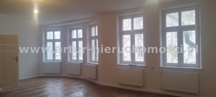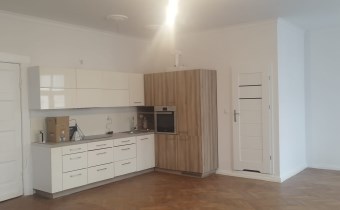 Na pierwszym piętrze w budynku wielorodzinnym, lokal mieszkalny o powierzchni 87,70 m². Większa część mieszkania (ok. 50–60 m²) po remoncie – przestronny salon z aneksem kuchennym w zabudowie i wyposażeniem, łazienka z kabiną prysznicową, odnowiony parkiet, okna PCV, centralne ogrzewanie gazowe. Mieszkanie wysokie, jasne, zadbane.